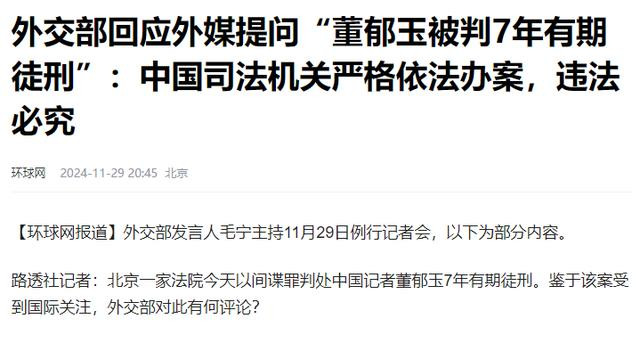 信息源:外交部回应外媒提问“董郁玉被判7年有期徒刑”:中国司法机关严格依法办案,违法必究,环球网2024-11-29。